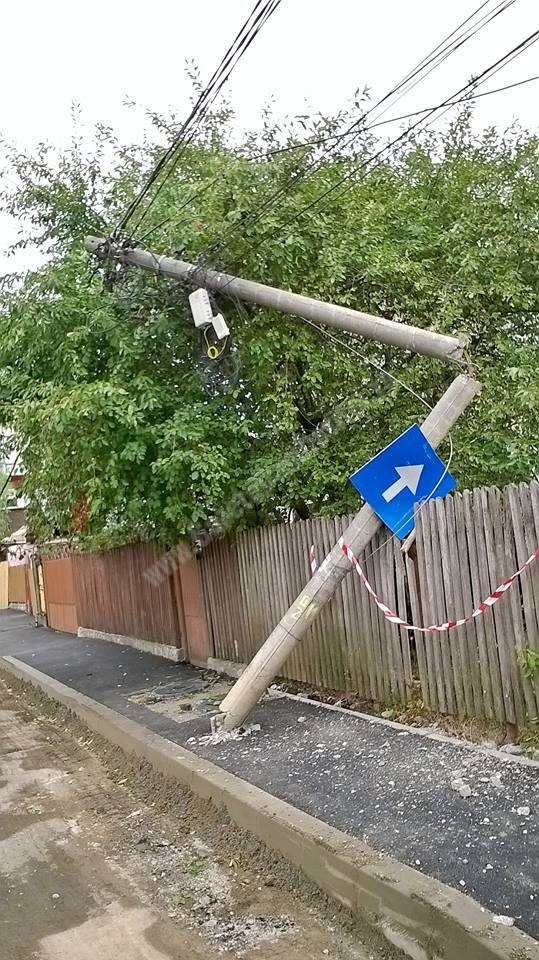 Un stâlp de pe strada C. Brâncoveanu din Târgovişte abia se mai „ţine” de cablurile electrice şi cele de internet. Stâplul era în picioare în această dimineaţă, dar acum cablurile sunt singurul lui sprijin. Localnicii povestesc că au observat în jurul prânzului că stâlpul a fost rupt de un utilaj care executa lucrări pregătitoare pentru asfaltarea respectivei străzi. Ulterior, utilajul a fost urcat pe o platformă şi retras din zonă. La ora 18:00 au plecat şi cei câţiva muncitori, nu înainte, însă de a lega o panglica de avertizare între stâlp şi gard.