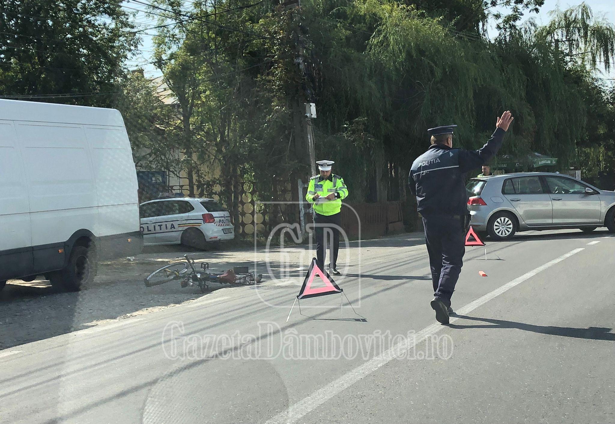 Polițiștii dâmbovițeni au fost solicitați să intervină, în jurul orei 12:00, în cazul unui accident rutier petrecut pe raza localității Valea Voievozilor. Din primele informații rezultă că un conducător auto a lovit un bărbat care se deplasa pe o bicicletă. Din pricina incidentului, circulația a fost direcționată pe un singur sens.